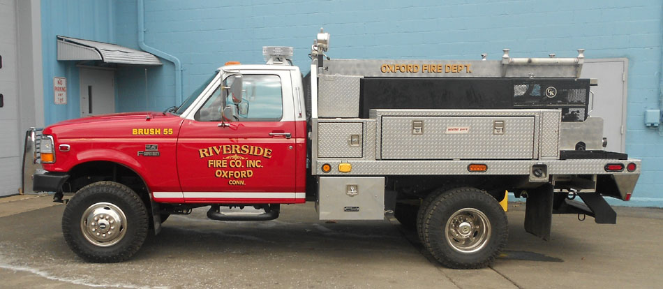 | We are pleased to be able to bring new life to Oxford's brush truck. Attached are pictures of "Brush 55", that we built back in 1997. Upgrades as follow: -New Darley 2 1/2" AGE Pump -New FRC Tank Gauge -New Whelen Freedom Lightbar -New Whelen Front, Side and Rear LED Warning lights -New Whelen LED Nightfighter Bulbs -New LED Rear Brake, Tail, Turn and Reverse Lights -New LED Clearance Lights -New LED License Plate Bracket -New Rear 6" Chevrons |