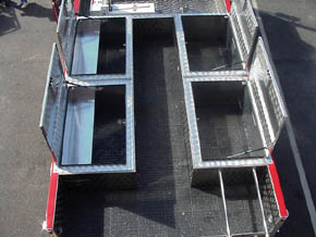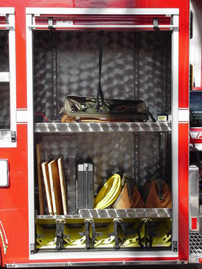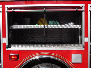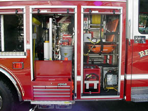 1. 15-foot non-walk-in stainless steel rescue body with painted Robinson roll-up compartment doors, mounted on a Spartan Metro-Star four (4) door custom chassis. Spartan Metro Star chassis features a six (6)-man cab, with A/C, a Cummins 350 HP engine, and an Allison World transmission. 2. Rescue includes a 25kW P.T.O. generator. 3. Body includes numerous Hannay electric and utility air reels. 4. Top view of the Wil-Burt 4,000 watt light-tower. 5. Top view of roof top compartments. 6. Right side view of the heavy-duty slide-out tool board, accessible from both sides of the body. 7. Right side view of custom mounted equipment and accessories. 8. Left side front compartment showing a view of the light-tower controls, and A/C panel, and slide-out tool board. 9. Left side compartment located above the rear axle with storage and an adjustable shelf. 10. Left rear compartment showing S.C.B.A. cylinder storage and rescue air bag and miscellaneous storage. 11. Rear hydraulic rescue tool compartment with ceiling mounted hydraulic reels each including 100 feet of hydraulic hose, electric and hydraulic power supplies, and a heavy-duty slide-out tray with mounting of heavy-duty hydraulic spreader and cutter. Center tray for mounting of rescue tools accessories such as hydraulic spreaders, chain packages, etc. 12. Right side view of heavy-duty slide out toolboard with pneumatic rescue struts mounted on the back. |