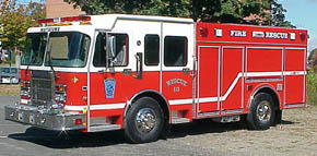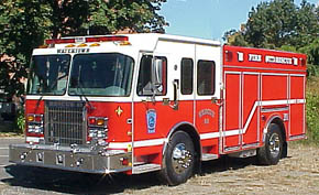 | Hot off the presses, this is Watertown Fire's newest addition, delivered Oct 2000. Shown below, are a number of photos highlighting the effective use of compartment space. The end result is such that Gowans-Knight has produced a compact, yet highly efficent, rescue vehicle. |