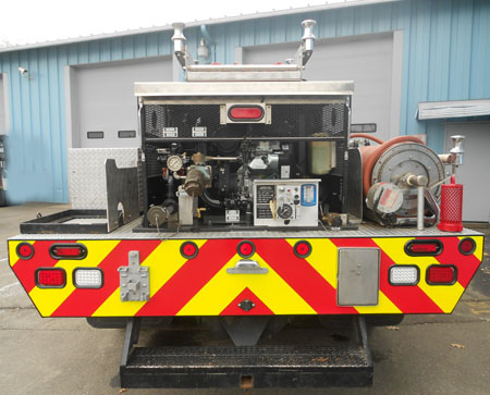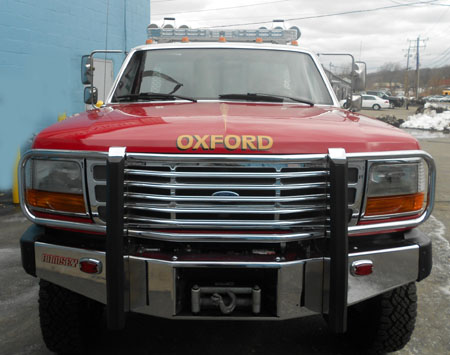 | We are pleased to be able to bring new life to Oxford's brush truck. Attached are pictures of "Brush 55", that we built back in 1997. Upgrades as follow: -New Darley 2 1/2" AGE Pump -New FRC Tank Gauge -New Whelen Freedom Lightbar -New Whelen Front, Side and Rear LED Warning lights -New Whelen LED Nightfighter Bulbs -New LED Rear Brake, Tail, Turn and Reverse Lights -New LED Clearance Lights -New LED License Plate Bracket -New Rear 6" Chevrons |